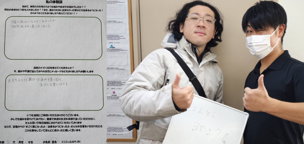 Q.「初めて、来院された時どのような痛みや症状でお悩みでしたか?現在お身体はどう変化されました??また、痛みのために出来なかった事などが出来るようになった!そのようなこともありましたら教えてください!!」 A.肩こり+首の痛みがひどく、目薬を支えなしでさせなかった。3回の施術を受けて肩がすごく楽になりました。ありがとうございました。また戻ってきます!! Q.「当院のイイトコロを教えてくれませんか?今、痛みや不調で悩んでおられる方にメッセージなどもありましたらお願いします」 A. 先生がお二人ともすごく優しくて、いつも患者目線で施術してくれるのですごく安心できます。施術自体も効果が目に見えて分かるので励みになるし普段の生活で気を付ける事なども指導してくれるので、毎日習慣的に姿勢を気にしていられます。 |